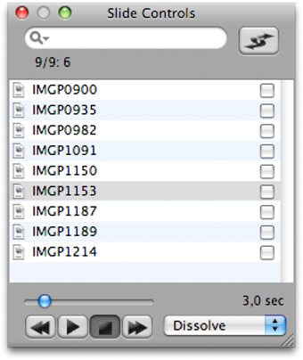 L'intérêt principal de ce logiciel est la création de diaporamas. Les fonctions sont facilement accessibles depuis une petite fenêtre amovible regroupant tous les réglages. Choisissez d'un simple clic l'intervalle et le mode de transition entre deux diapositives. On retrouve aussi les contrôles de lecture classiques, pause avance et retour rapide. Pratique, une barre de recherche intégrée vous aide à retrouver rapidement un cliché en particulier. On apprécie aussi le mode de lecture aléatoire, rare dans ce genre de programme.